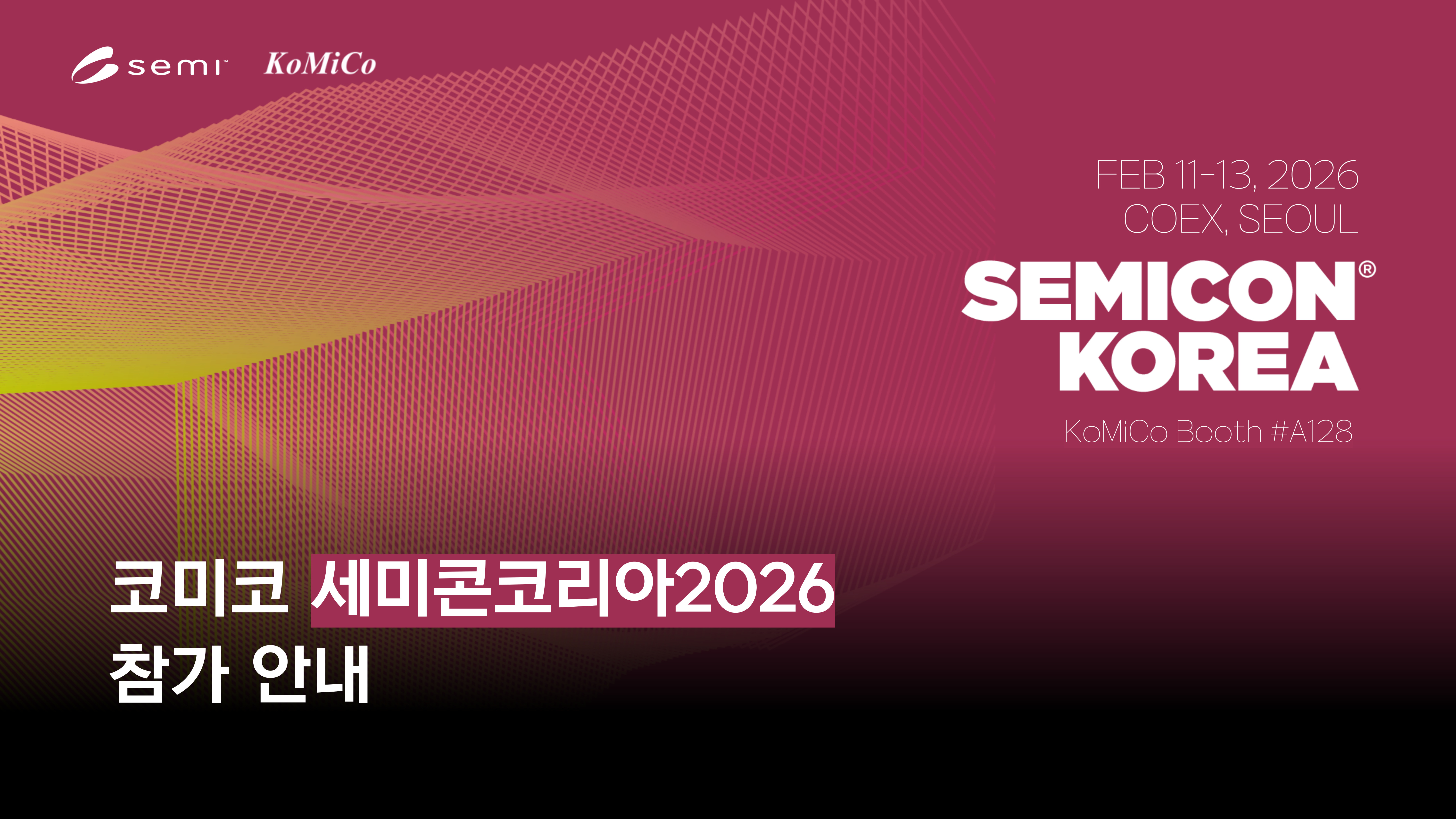 반도체 산업을 대표하는 글로벌 전시회 세미콘코리아 2026 (SEMICON KOREA 2026)에 반도체 장비 부품 세정·코팅 전문 기업 코미코(KoMiCo)가 참가합니다.세미콘 코리아 2026은 역대 최대 규모로 개최될 예정인 반도체 전문 전시회로, 국내외 반도체 소재·부품·장비 기업은 물론, 산업 전반의 주요 관계자들이 대거 참여하는 자리입니다. SEMION KOREA 2026전시 기간2026년 2월 11일(수) ~ 2월 13일(금)전시 장소서울 코엑스(COEX), 1층 A홀부스 번호A128 코미코는 반도체 장비 부품 정밀 세정(Cleaning) 및 고기능성 코팅(Coating) 기술 서비스를 제공하며, 부품 청정도 확보와 공정 안정성 향상에 기여하고 있습니다.이번 전시회에서는 코미코의 세정·코팅 기..